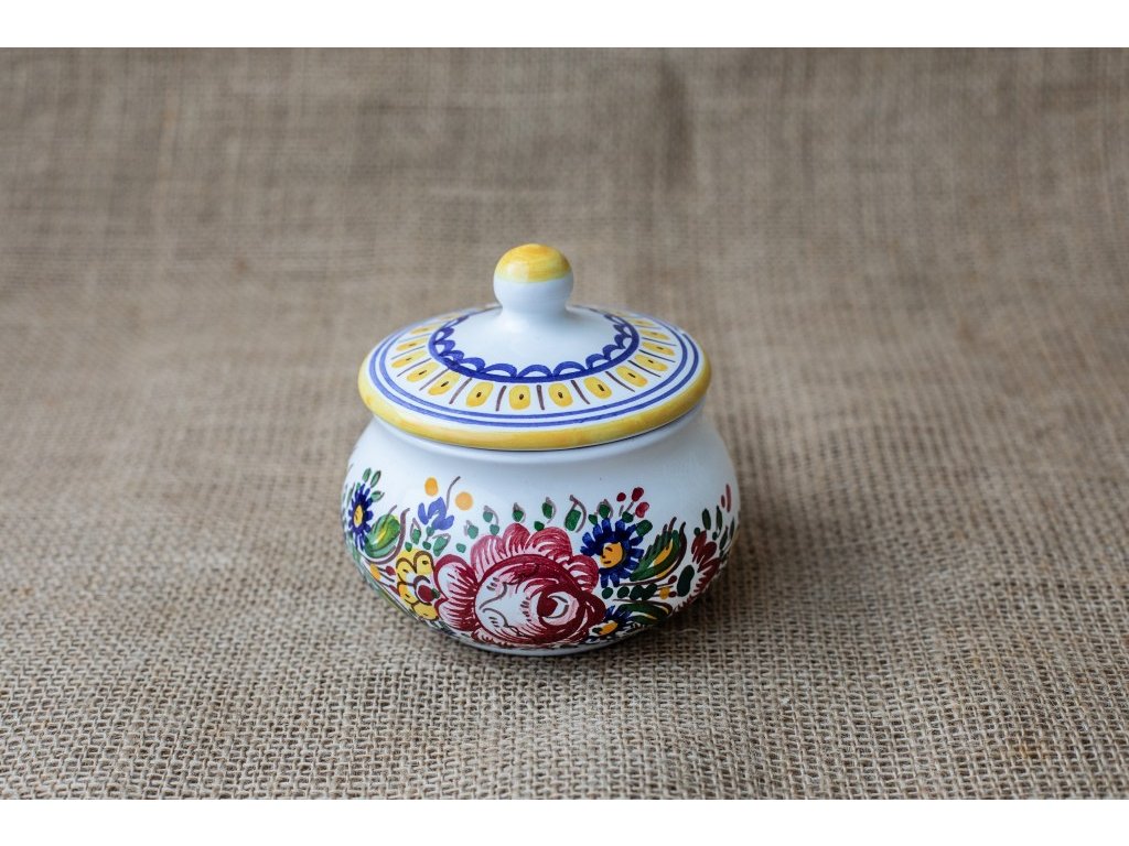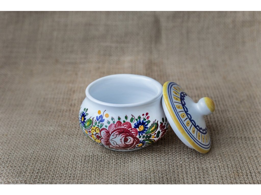 Oslaďte si svůj život a kupte si tuto luxusní cukřenku s víčkem. Hodí se také jako úžasný doplněk, který Vašemu domu dokonale podtrhne rustikální styl nábytku? Tato keramická, ručně malovaná cukřenka je skvělou ozdobou do Vaší kuchyně. Cukřenka je zdobena tradičními slováckými vzory. Keramiku lze mýt v myčce. Neváhejte a objednejte si tuto famózní cukřenku na našem e-shopu.