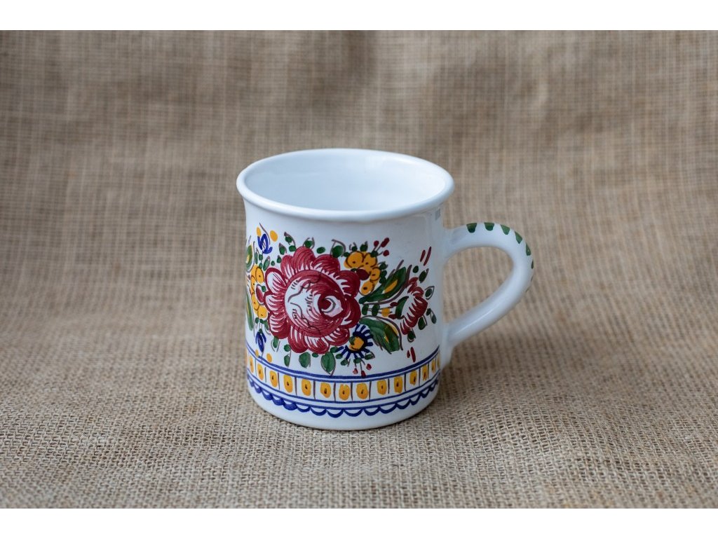 Rovný, barevně malovaný hrnek Vás okouzlí svou precizní prací a také ručně malovanou, slováckou růží. Je úžasným doplňkem do Vašeho obydlí, nebo jako ozdoba na polici. Také se hezký hodí k Vašemu rustikálnímu stylu nábytku. Hrnek je zdoben tradičními slováckými vzory. Keramiku lze mýt v myčce.