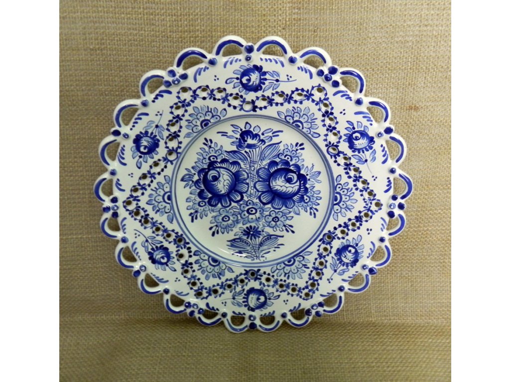 Tento překrásný talíř uchvátí každého svou křehkou krásou, kterou jí vtiskli hrnčířští mistři. Je malován typickou slováckou modrou růží a zdoben dírkováním. Po okraji jeho krásu umocní ještě krajka. Skvěle vynikne na bílé zdi nebo tmavé polici. Vaše kulinářské výtvory se na tomto talíři stanou neodolatelnými.