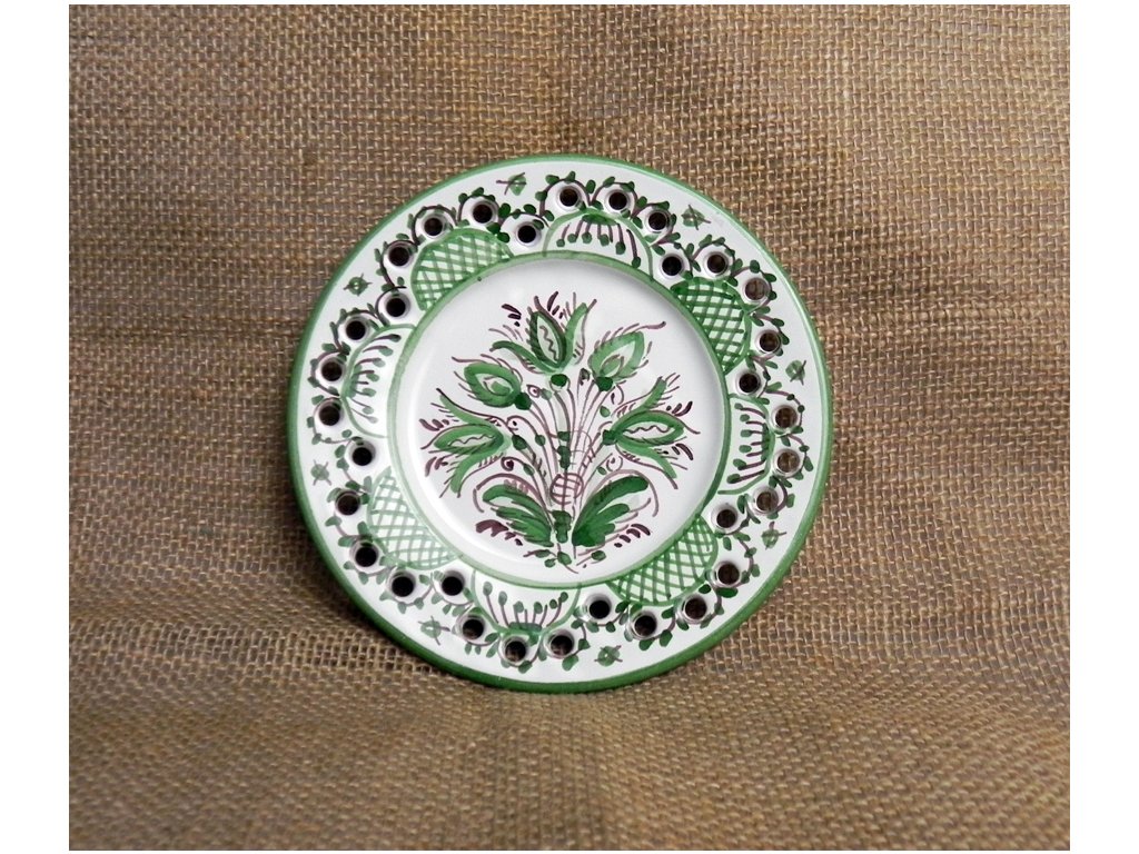 Zelená nejen na jaře! Zelený talířek malovaný habánským vzorem a zdobený jemným dírkováním - řežbou. Vynikne ve vašem příborníku či ozdobí zeď v kuchyni i jinde. Můžete jej pověsit i na zeď. Stejně jako ostatní výrobky je i tento talířek originálním výtvorem slováckých hrnčířů.