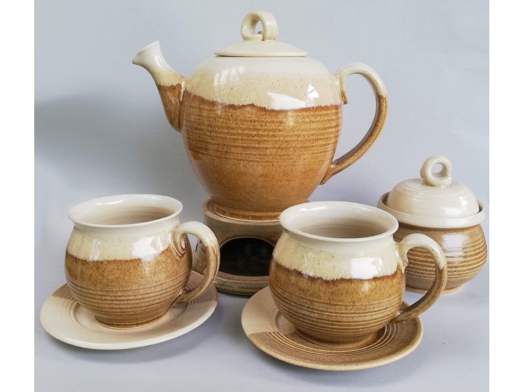 Kompletní čajový set, včetně ohřívadla. Kameninová souprava obsahuje konvici na čaj, dva hrnky s podšálky, cukřenku a ohřívadlo. Do ohřívadla si zapálíte svíčku a čaj budete mít příjemně horký celý večer.