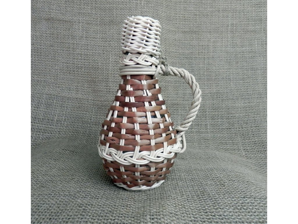 Malá lahvička je perfektní, cestovní velikosti, ideální na košt. Už se nemusíte obávat dalších rozbitých lahví, s touto opletenou budou všechny tekutiny v bezpeční. Lahev je opletena bílým lýkem z proutí vrby a tmavého ratanu, opletení chrání ji a hlavně její obsah před případným pádem. Proutěné ucho je velmi praktické a zaručuje bezpečnou manipulaci. Lahev je opatřena korkovým špuntem, který je také opletený.