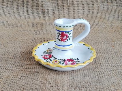 Výška svícnu s uchem je 10 cm, průměr je 14 cm. Svícen je ručně malovaný. Svícen je vhodný k rustikálnímu nábytku, na chalupu. Ruční malba dělá ze svícnu originální součást nábytku.